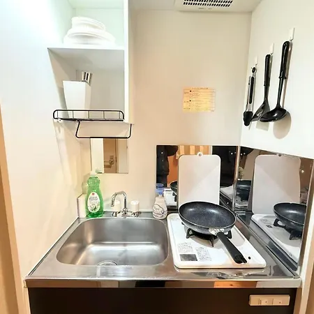 Ces appartements Shinjukuokubo Sa comprend une cuisine complète équipée d'un réfrigérateur, d'une bouilloire et de la vaisselle.